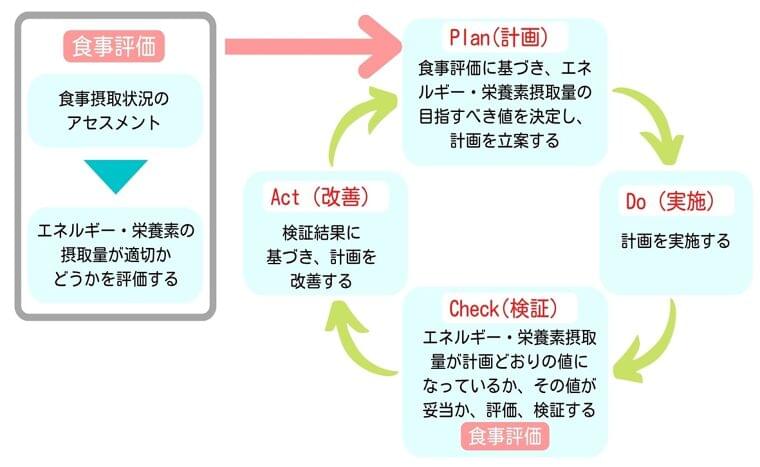 まず、食事摂取状況のアセスメントにより、エネルギー・栄養素の摂取量が適切かどうかを評価します。食事評価に基づき、食事改善計画の立案(Plan)、食事改善を実施し(Do)、検証(Check)を行います。検証を行う際には、食事評価も合わせて行うようにします。その結果を踏まえ、計画や実施の内容を改善(Act)します。