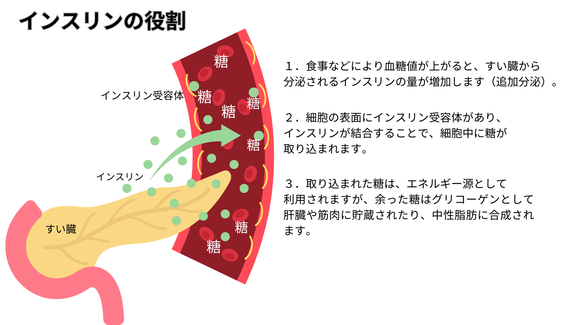 インスリンとは、すい臓のβ細胞から分泌されるホルモンの一種で、糖の代謝を調節し、血糖値を一定に保つ働きを持っています。また、血糖値を下げる唯一のホルモンでもあります。