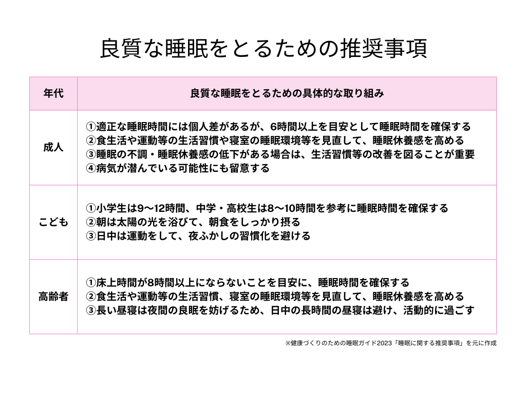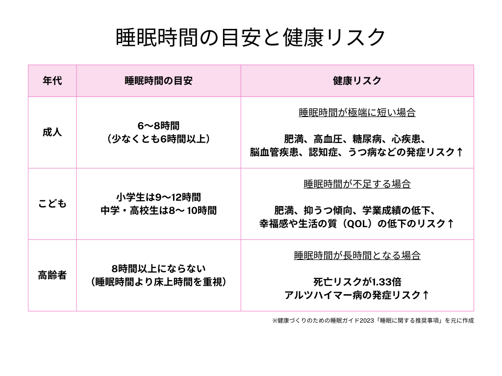 年代別の睡眠時間の目安と健康リスク、良質な睡眠をとるための推奨事項をまとめました。