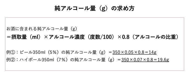 本ガイドラインでは、自分に合った飲酒量を把握するために、お酒に含まれる純アルコール量の算出式が示されています。算出式を用いることで、食品のエネルギー(kcal)のようにその量を数値化できます。