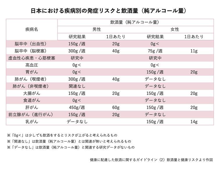 お酒に含まれる純アルコール量を算出できたら、次にさまざまな疾病の発症リスクとの関連を知ることが大切です。本ガイドラインでは、日本人を対象とした研究のエビデンスに基づいた、飲酒量(純アルコール量)と疾病の発症リスクが示されています。