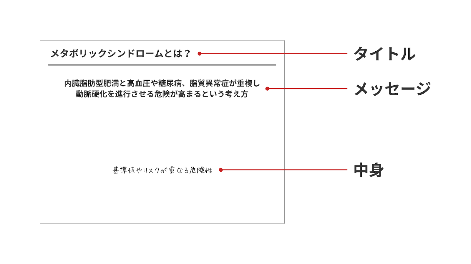 タイトルとメッセージを伝えるための中身を書き出します。必要なグラフや表などがあれば、この時点で準備しておくとよいです。
