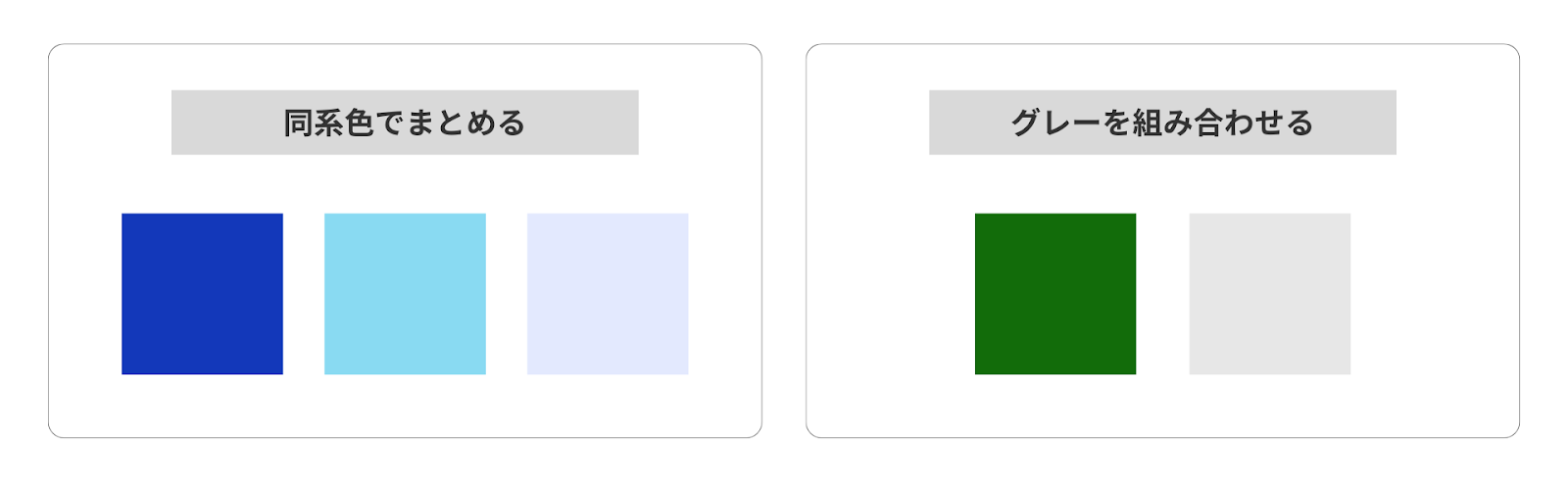 メインカラーを元に、色を選びます。例えば、同系色でまとめる、グレーと組み合わせる等が配色しやすいです。