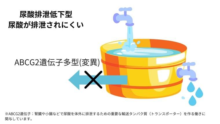 なお、高尿酸血症のコラムでご紹介した「尿酸産生過剰」と「尿酸排泄低下」という2つの機序に加え、ABCG2遺伝子による排泄低下も「尿酸排泄低下型」に含まれます。これらは腎臓に負担をかける“腎負荷型”とされ、腎臓病の予防という観点からも注目されています。