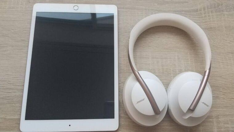 (左)パソコン業務を補佐してくれるタブレット (右)BOSEのノイズキャンセリング機能付きヘッドフォン