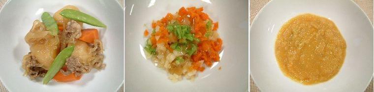 常食・きざみ食・ミキサー食と、やわらか食「ソフリ」との見た目の比較