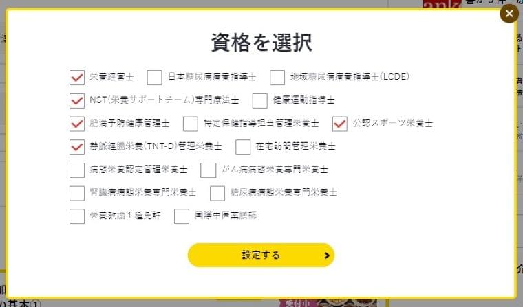 トップ画面の右上の「設定」を押すと資格を選択できるポップアップが出るので、対象の資格にチェックを入れてください。