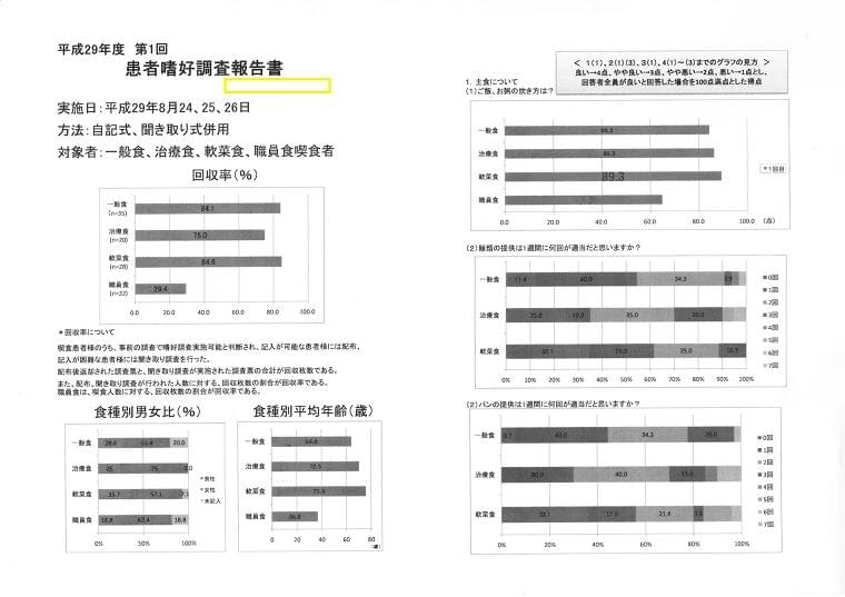 内容:1食毎に献立名、栄養量が記載され、検食者は主食の硬さや汁物、主菜、副菜の味付けや盛り付けについて