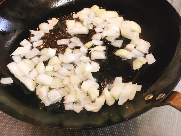 ④ フライパンに油を熱し、玉ねぎを炒めます。