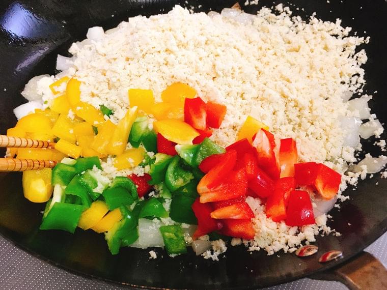 ③ 玉ねぎ・ピーマン・赤パプリカ・黄パプリカは1cm角にカットしておきます。