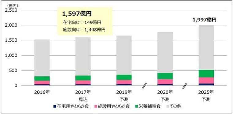 高齢化率(65歳以上人口の割合)は、2016年時点で27%であり、2040年には35%を超える予測となっていて、高齢化率はますます高まっています。その影響で高齢者向けの食品市場も年々拡大し、高齢者施設では慢性的な人員不足が見られるという背景のなか、調理済み食品の需要が高まっています。また、在宅介護現場でも既製品を使用することで摂取栄養素の把握がしやすいということからも、高齢者向けの商品への注目度が高くなっています。