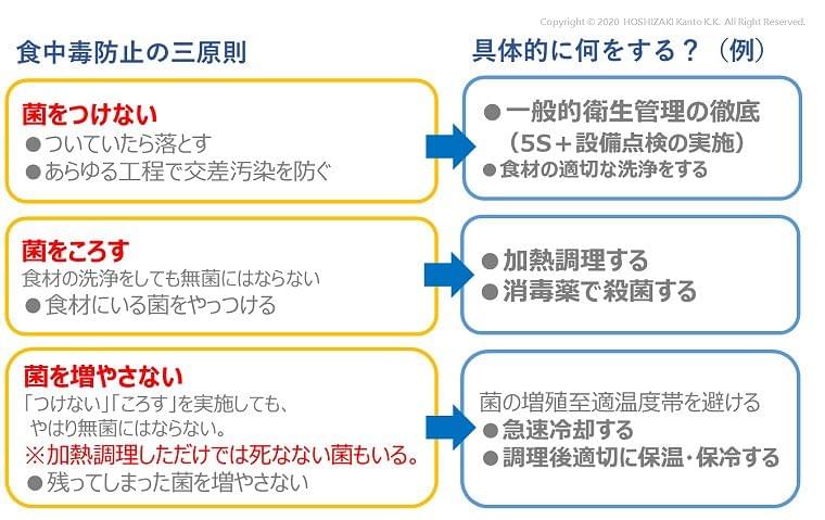 加熱するメニューは、食中毒の生物的ハザードが死滅する温度・時間で加熱し「やっつけ」、提供まで適切に保温しておいて、「増やさない」ようにします。