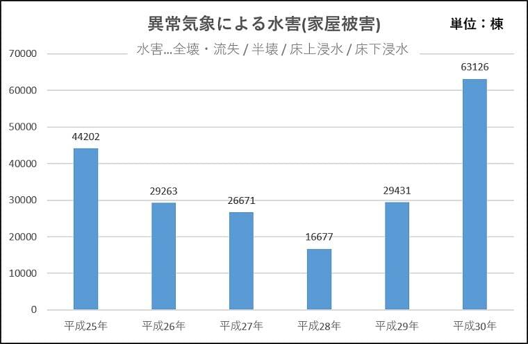 それにもかかわらず、平成25年から平成30年までに異常気象による水害を受けた家屋は平均約35000棟です。