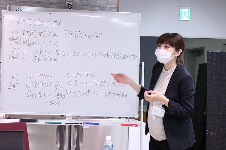 最初に、厚生労働省の「標準的な検診・保健指導プログラム(平成30年版)」に沿って、特定保健指導の概要を解説させていただきました。その後、管理栄養士と看護師の経験を持つ講師から、病態と栄養アセスメントの解説があり、検査データから読み取る方法の説明がありました。