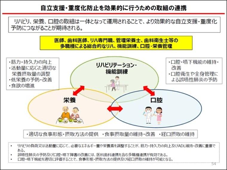 今回の改定の大きなポイントの一つとして、「リハビリテーション・機能訓練、口腔、栄養の取組の連携・強化」があり、リハビリ、栄養、口腔の取り組みは一体となって運用されることで、より効果的な自立支援・重度化予防につながることが期待される、と示されています。(図1)