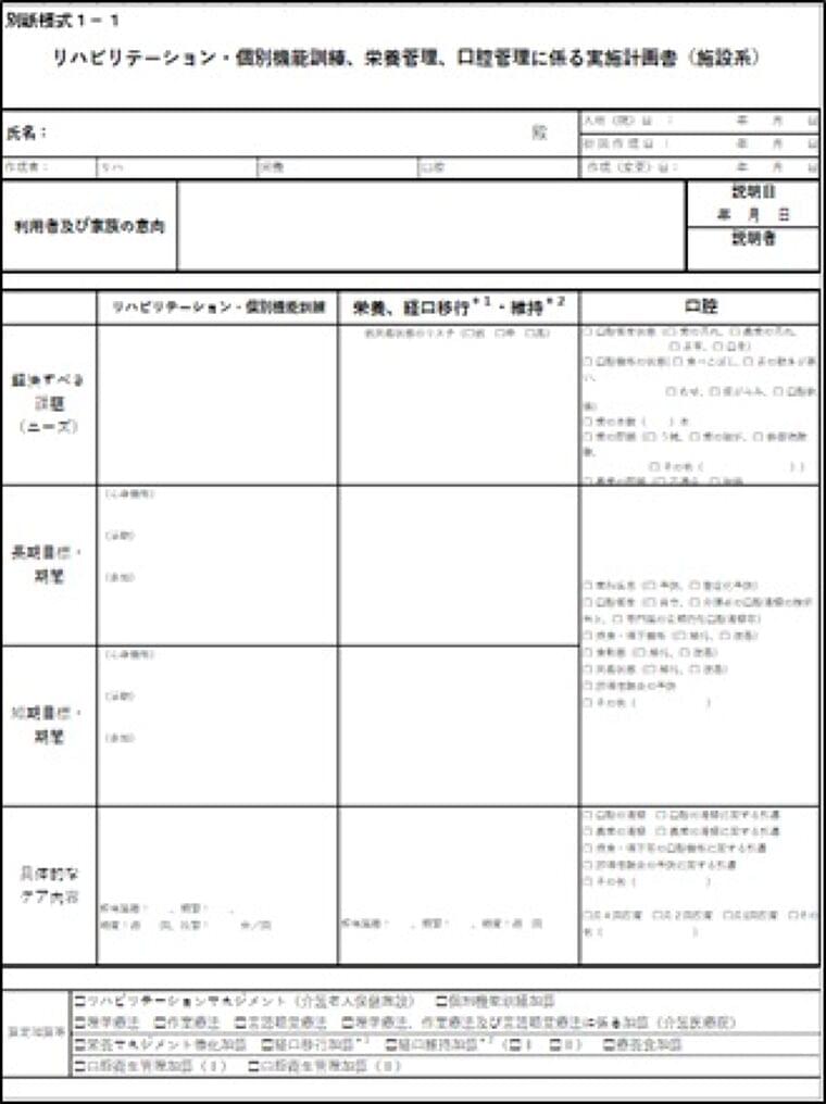 リハビリ、栄養、口腔が一体となり取り組むことで、各種計画書も一体的な様式(図2)にすることが勧められています。各種計画書は重なっている情報もあり、重複する記載項目を整理するとともに、それぞれの実施計画を一体的に記入できる様式を設ける、とされています。