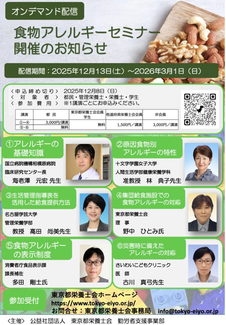 • 食物アレルギーセミナー(⑥災害時に備えたアレルギーの対応)【12/8 締切!! オンデマンド配信】