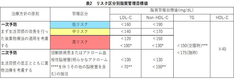 これは、国内でのアテローム血栓性脳梗塞が増加傾向であり、再発予防が重要になるためです。また二次予防の場合、糖尿病の合併がプラーク退縮の阻害要因となることなどから、これまで厳格なコントロールは合併症などがあるハイリスクの糖尿病のみが対象でしたが、今回より糖尿病全般においてLDL-C 70mg/dL未満となりました。(表2)