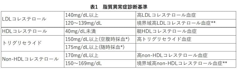 トリグリセライド(TG)は食事の影響を受けやすく、食後上昇します。また空腹時でも非空腹時でもその値が高いと将来の冠動脈疾患や脳梗塞の発症・死亡を予測することが国内の疫学調査で示されています。国内の疫学研究の結果やESC/EASガイドラインとの整合性も考慮して、空腹時採血:150mg/dL以上または随時採血:175mg/dL以上を高TG血症と診断します。高TG血症を含め脂質異常症の診断は従来空腹時採血で行われてきましたが、食後のTG高値が動脈硬化性心血管リスクとして注目されています。冠動脈疾患予防の観点から脂質異常症の診断基準値を表1のように設定しています。