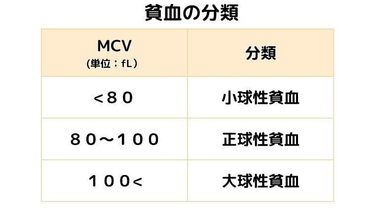 貧血は、赤血球1個当たりの大きさを示すMCV(平均赤血球容積)の数値により3つに分類されます。