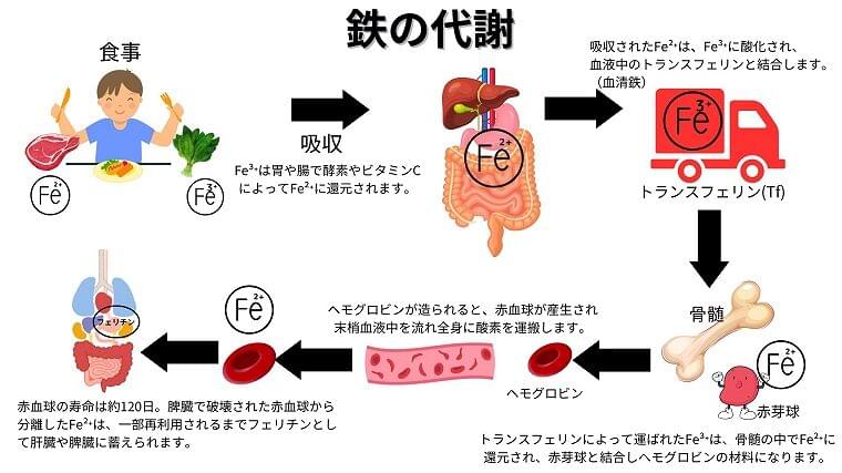食事などからとる鉄が不足すると、鉄を運搬するトランスフェリンは多くなり、トランスフェリンと鉄が結合した血清鉄は少なくなります。