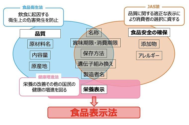 食品表示に関する法律は、「食品表示法」が中心となっていますが、実は施行されてから10年未満の比較的新しい法律です。「食品表示法」が施行される前は、食品衛生法、日本農林規格等に関する法律(JAS法) 、健康増進法といった個別法によって食品表示が規定されていましたが、法律によって重複する部分や用語の使い方に違いがあるなど、消費者や食品事業者には複雑でわかりにくいとされていました。