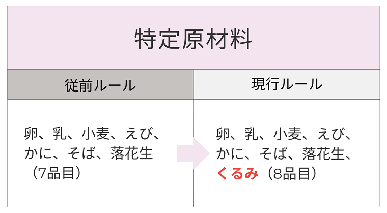 このうち「特定原材料」には、食品表示基準の一部改正により令和5年3月9日から「くるみ」が追加されました。食物アレルギー表示の経過措置期間として、令和7年3月31日までに製造・加工された食品、輸入される加工食品(業務用加工食品を除く)、同日までに販売される業務用加工食品については、新しい規定にかかわらず従前ルールに従って表示することができます。
