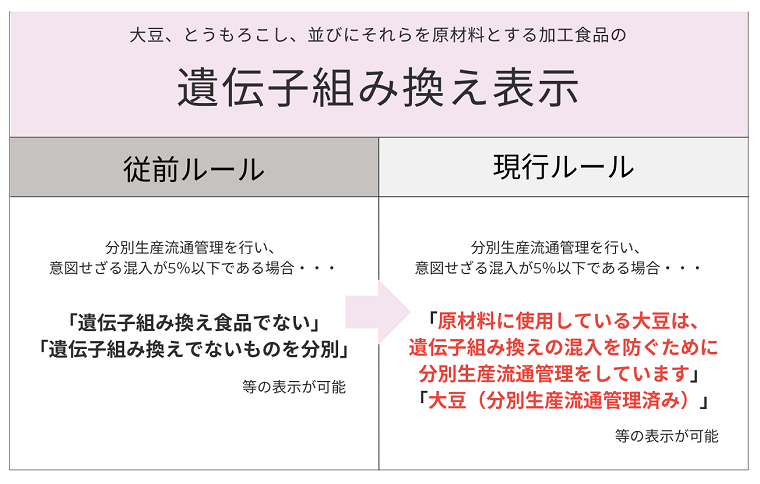 大豆、とうもろこし、またそれらを原材料とする加工食品については、分別生産流通管理を行なった上で、遺伝子組み換えの混入率が5%以下であれば「遺伝子組み換えでない」と表示することができていました。しかし食品表示基準の一部改正により、平成31年4月25日から表現を厳格化することとなりました。改正後の現行ルールで「遺伝子組み換えでない」と表示するには、第三者機関によって遺伝子組み換え食品の混入がないと認められた場合に限ります。