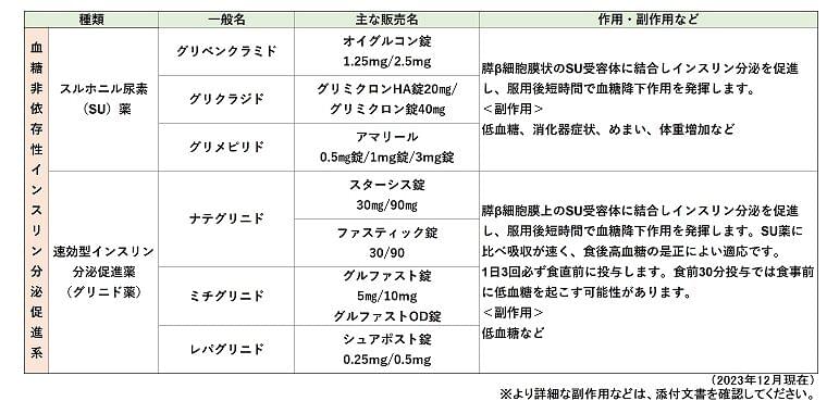 糖尿病治療薬は、「インスリン分泌非促進系」、「インスリン分泌促進系」、「インスリン製剤」の3種類に分けられます。また、投与方法により経口薬と注射薬に分けられます。