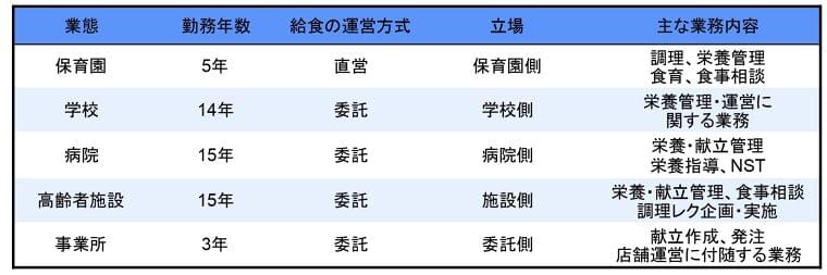 エンドーサーの皆さんの詳しい勤務年数や給食の運営方式などの情報は下記の表のとおりです。こちらを参考にしながら本コラムを読んでみてください。