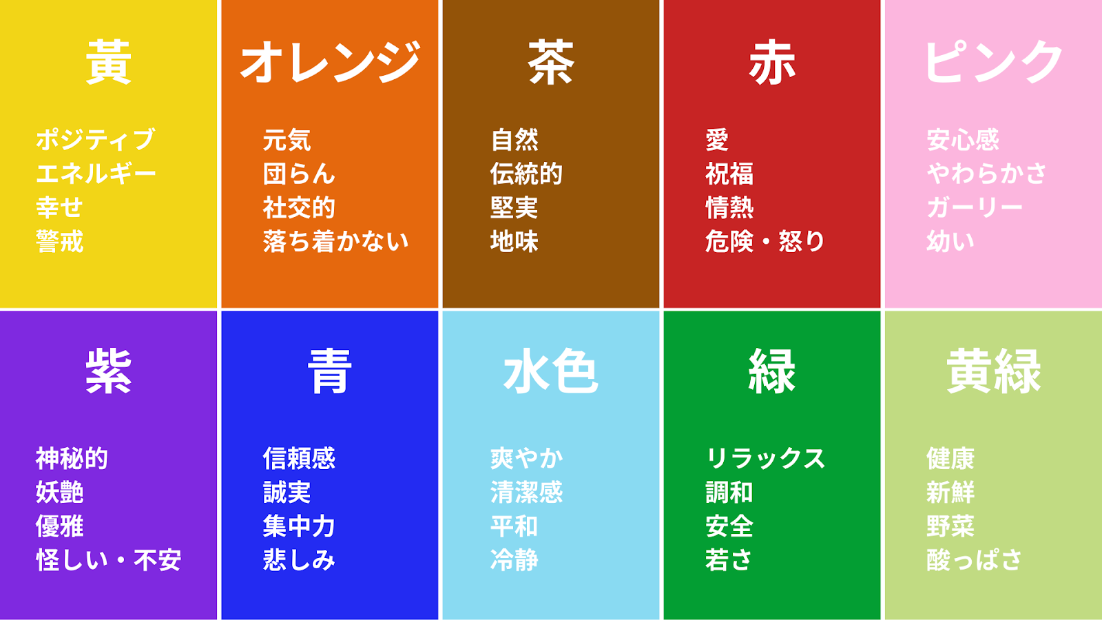 色にはそれぞれイメージがあります。使う色によって、与える印象が異なりますので、目的に合わせて色をうまく使いこなしましょう。