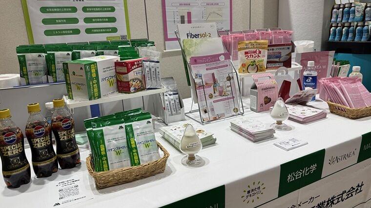 企業ブースでは、各社がセミナーの紹介やフードサンプルの展示、機能性を持つ商品の紹介などを行っており、大変な賑わいを見せていました。今回はブース内で紹介されていた「難消化性デキストリン」と「希少糖アルロース」についてご紹介します。