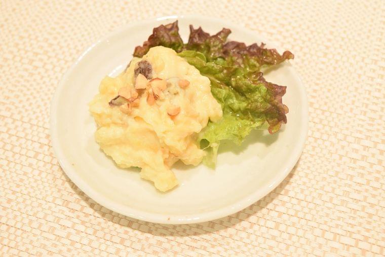②を軽くフォークの背でつぶし、レーズン、ヨーグルトを混ぜ、サラダ菜とともに盛り付ける。