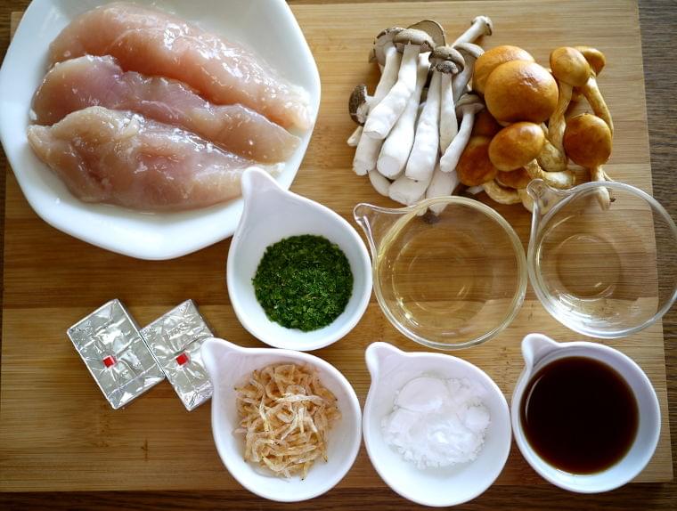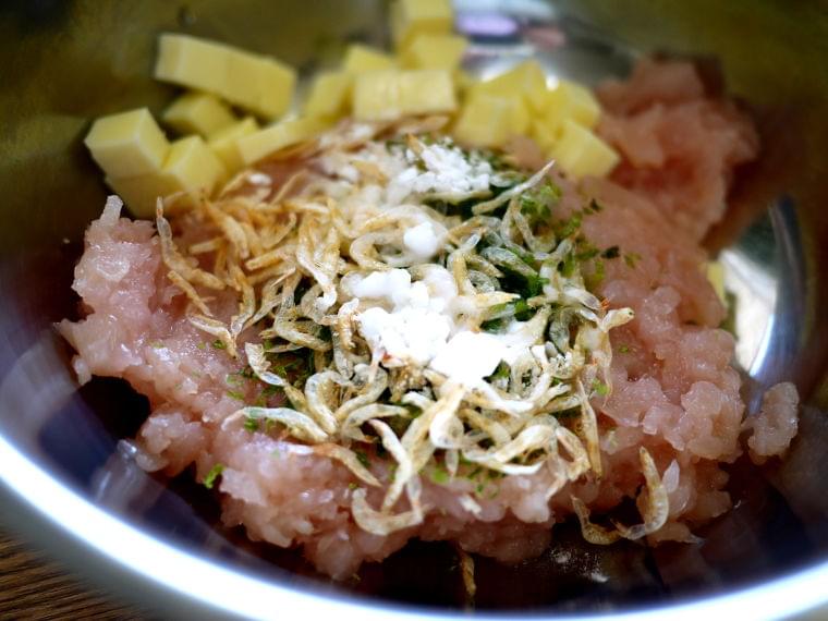 今回は、この鶏ささみにカルシウムたっぷりの「あおさ」「桜えび」「チーズ」を入れてまとめて鶏つみれ焼きを作ります。「きのこ」のソースで仕上げてみました。