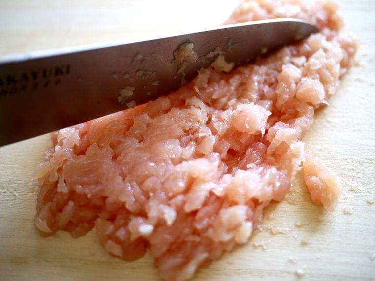 ①ささみは包丁でざく切りにしてから叩いてまとめやすくします