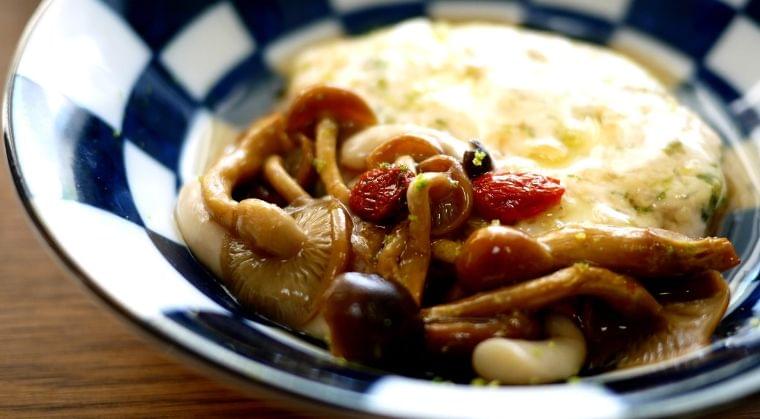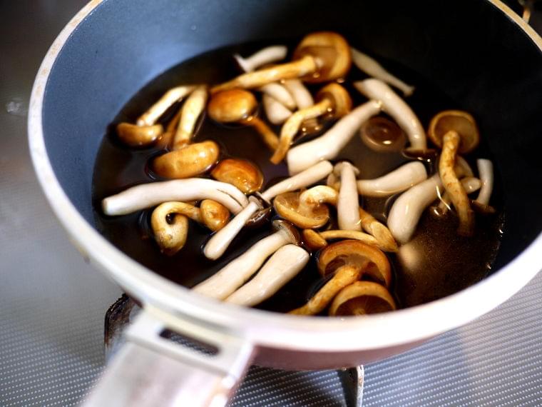 ④小鍋に片栗粉以外の[A]の材料を入れてほぐしたきのこ・クコを入れて煮立て、水溶き片栗粉でとろみをつけて③にかけます
