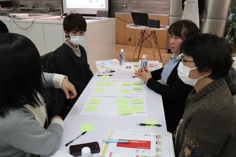 次に、4人1組のグループとなり、職場や自宅で行っている防災食に関する取り組みについての情報交換を行いました。まずは、防災について各自行っていることを付箋に書き出し、次にグループ内でシェアしてから、グループから出た情報を全体に共有していただきました。