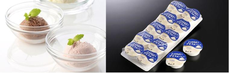アイスクリームは多くの人々が好むデザートですが、液状になりやすいため、ゆっくりお食事を召し上がる方には、喫食が難しいとされています。しかし「とけないアイス風デザート」は、冷凍庫から取り出しても、1時間程度は液体になることなくアイスクリームのようにお召し上がりいただけます。