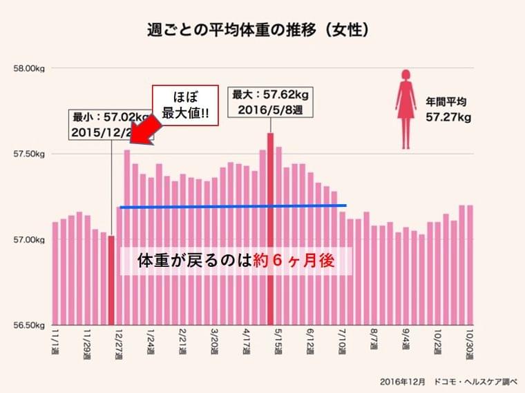 ここで、体重記録アプリを提供している会社が行った調査のデータをご紹介します。そのデータによると、1年を通して一番太る時期が、お正月シーズンでした。さらに恐ろしいことに、その増えた体重が戻るのはなんと、7~8月頃でした。恐るべし、正月太り。