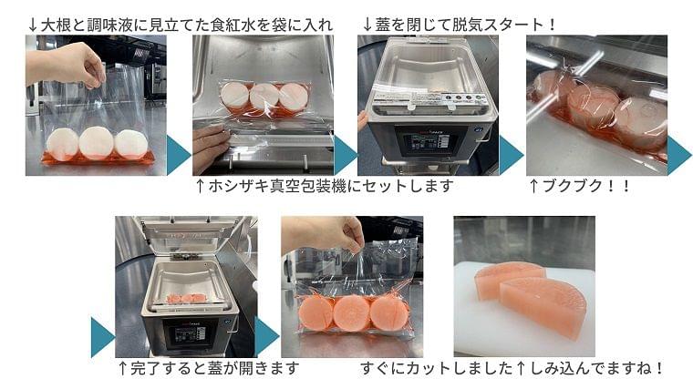 さらに加熱をしなくても、単純に真空包装する仕組みを活用して、たった1分で浅漬けやピクルスを作ったり、肉や魚の漬け込みを行うこともできます。