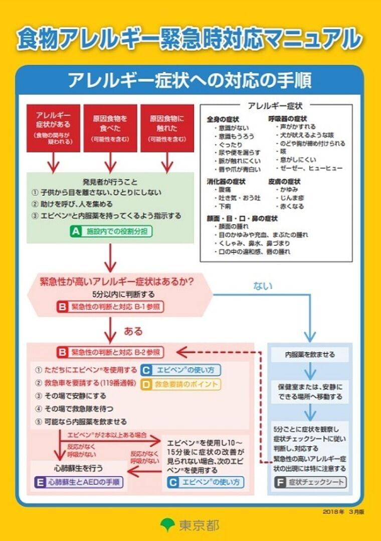 アナフィラキシーについては、東京都福祉保健局が運営している「東京都アレルギー情報navi.」にて、アナフィラキシー等のアレルギー症状への緊急時対応に備えて、対応の手順、役割分担、緊急性の判断と対応、エピペンの使い方、緊急要請(119番通報)のポイント等がフローチャート形式でまとめられています。