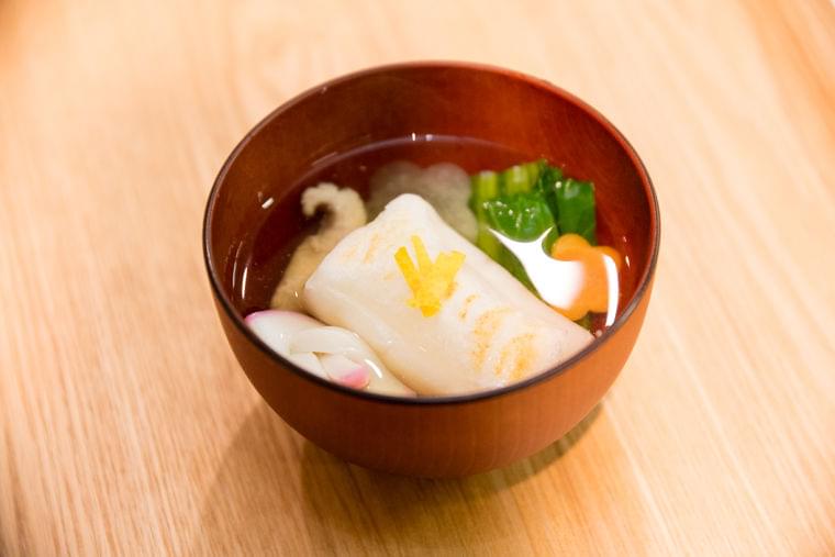 ⑦椀に①~⑤までの具材を盛り、⑥の吸地を注ぐ。最後にお好みでゆずの皮をあしらう。
