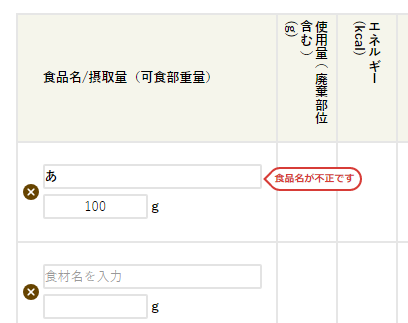 食品名欄への入力の途中で離れたり、存在しない食品名を入れたりすると、「食品名が不正です」という表示が出て入力ができなくなってしまう時があります。その時には、左端の「×」を押すと表示が消えて入力できるようになります。