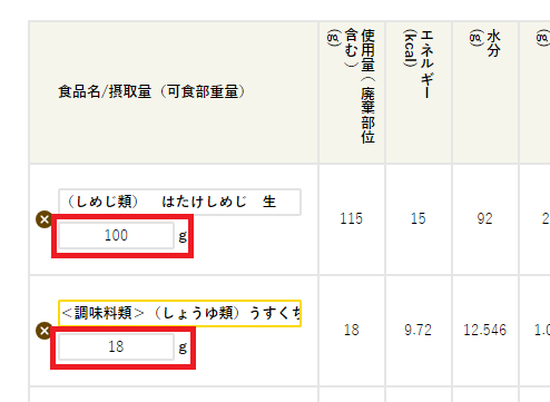 一般的な摂取量(可食部重量)が最初に表示されます。ここには計算したい重量(グラム)を入れてください。