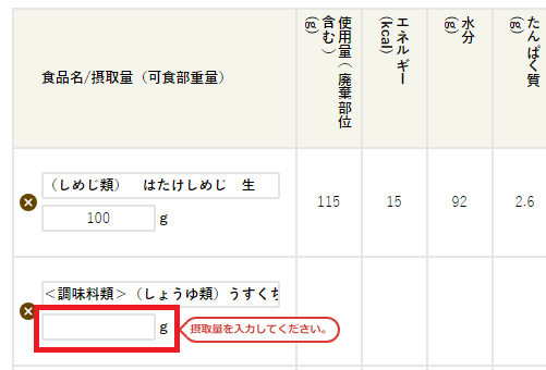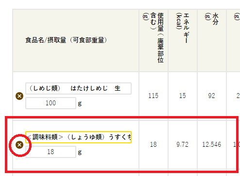 入力した食品名と摂取量を1行だけ削除したい場合には左端の「×」を押してください。1行のみ削除されます。