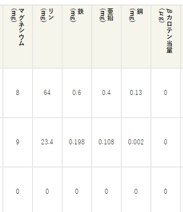 小数点3桁までを表示しています。成分表で「-」「0」「Tr」で表示されている微量な値は「0」として計算しています。また、推計値である()付の値は、推計値をそのまま採用しています。成分表に書かれている実際の記述は、日本食品標準成分表 収載食品一覧ページより確認できます。