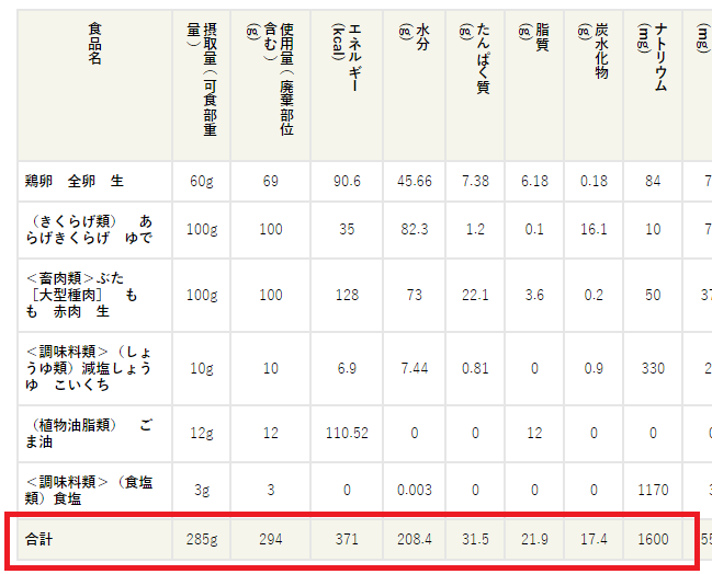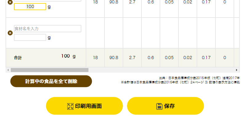 入力した食材全ての合計の値が表示されます。