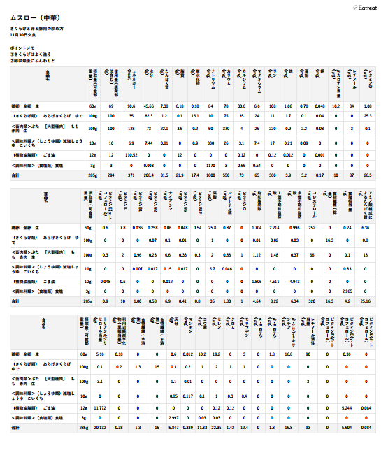 計算結果は、全栄養素が表示されます。必要に応じて、列を削除する、列を並び替えるなどをして、使いやすいようにカスタムできます。