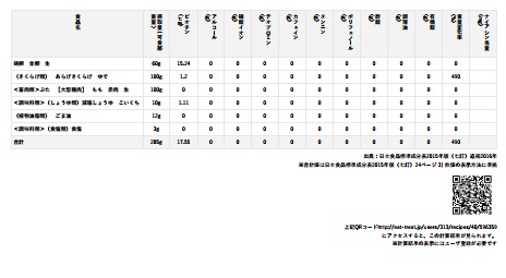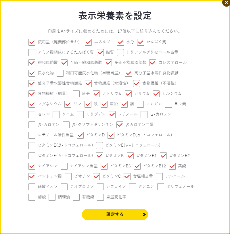 また、A4サイズの用紙1枚に印刷する場合には、表示栄養素を17個以下にすると栄養素を1行に収められます。