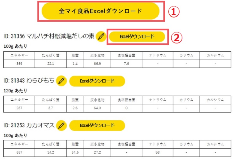 各マイ食品をダウンロードしたい時は、食品名の右側にある「Excelダウンロード」ボタンを押します。…②